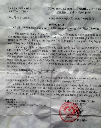 Sau nhiều ngày chờ đợi không thấy xã có quyết định công nhận bà Hiền là xóm trưởng xóm Ngọc Thượng, bà Hiền đã lên gặp ông Hòe để hỏi lý do thì được ông Hòe nói là kết quả bỏ phiếu tại buổi họp không đúng quy định. Cụ thể hơn, ngày 20/9/2016, ông Hòe đích thân ký văn bản thông báo gửi Chi bộ, Ban Công tác mặt trận xóm Ngọc Thượng với nội dung “không công nhận kết quả bầu cử xóm trưởng”.