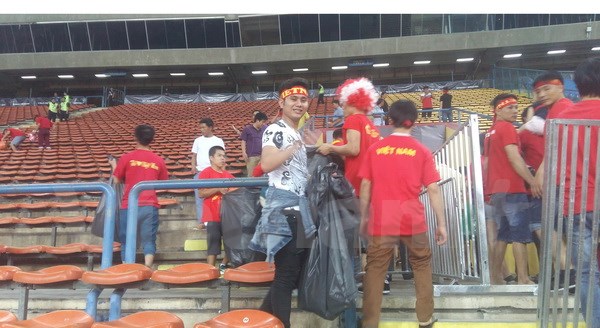Ngày 20/8, sau khi trận đấu giữa U22 Việt Nam và Philippines trên sân Shah Alam, bang Selangor kết thúc, dù đã hơn 11 giờ đêm nhưng vẫn có khá nhiều cổ động viên trong trang phục áo đỏ vẫn nán lại khu vực khán đài để thu dọn rác.