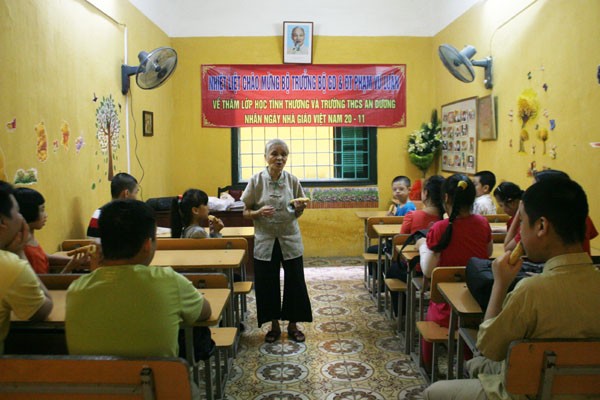 Gần 20 năm qua, bà Hồ Hương Nam (nay đã 83 tuổi) vẫn dạy học miễn phí cho những đứa trẻ kém may mắn tại lớp học tình thương ở Trường trung học cơ sở (THCS) An Dương (Q.Tây Hồ, Hà Nội).