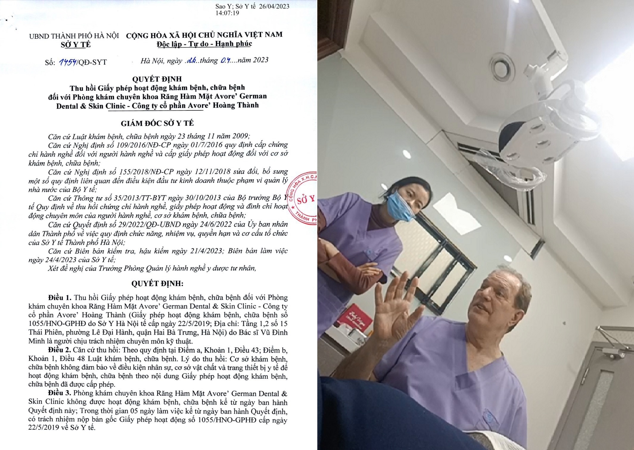 Sở Y tế Hà Nội đã ban hành quyết định số 1454/QĐ-SYTT thu hồi giấy phép hoạt động của Phòng khám chuyên khoa răng hàm mặt Avore’ do không đảm bảo điều kiện về nhân sự, cơ sở vật chất và trang thiết bị y tế.