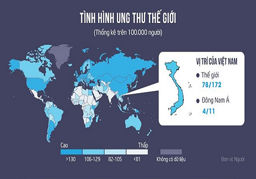 Việt Nam đứng thứ 4 Đông Nam Á và thứ 78 trên thế giới về tỷ lệ người chết vì mắc bệnh ung thư.