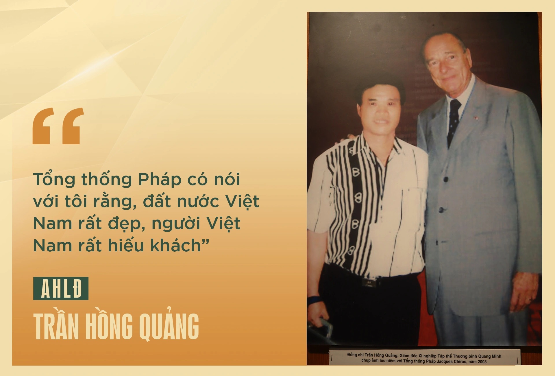 Đó là Anh hùng Lao động, thương binh Trần Hồng Quảng - Chủ tịch Hiệp hội Doanh nghiệp của Thương binh và Người khuyết tật Việt Nam, Chủ tịch Hội đồng quản trị kiêm Tổng giám đốc xí nghiệp Quang Minh (Hải Phòng).