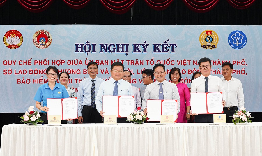 Chiều ngày 3/8, Ủy ban MTTQVN TP.HCM, Liên đoàn Lao động Thành phố, Bảo hiểm xã hội và Sở Lao động, Thương binh và Xã hội đã ký kết Quy chế phối hợp trong vấn đề lao động - việc làm trên địa bàn Thành phố giai đoạn 2023 - 2028.