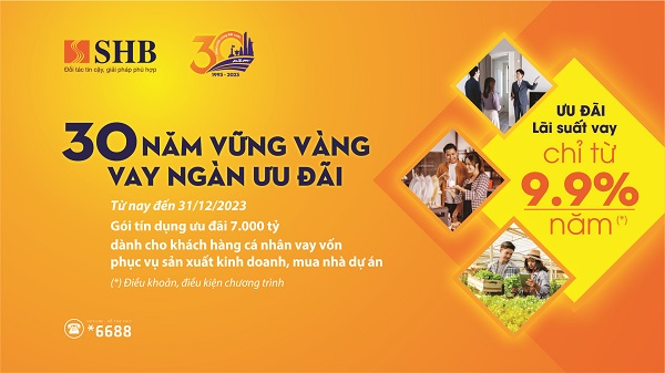 Nhằm giúp khách hàng cá nhân tiếp cận nguồn vốn vay với lãi suất ưu đãi, Ngân hàng Sài Gòn - Hà Nội (SHB) triển khai chương trình “30 năm vững vàng – Vay ngàn ưu đãi” với tổng hạn mức lên tới 7.000 tỷ đồng.