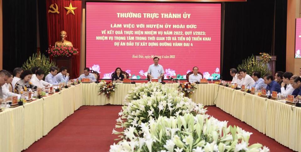 Ngày 6/4, Thường trực Thành ủy Hà Nội làm việc với Huyện ủy Hoài Đức về kết quả thực hiện nhiệm vụ năm 2022, quý 1/2023; nhiệm vụ trọng tâm trong thời gian tới và tiến độ triển khai Dự án đầu tư xây dựng đường Vành đai 4-Vùng Thủ đô.
