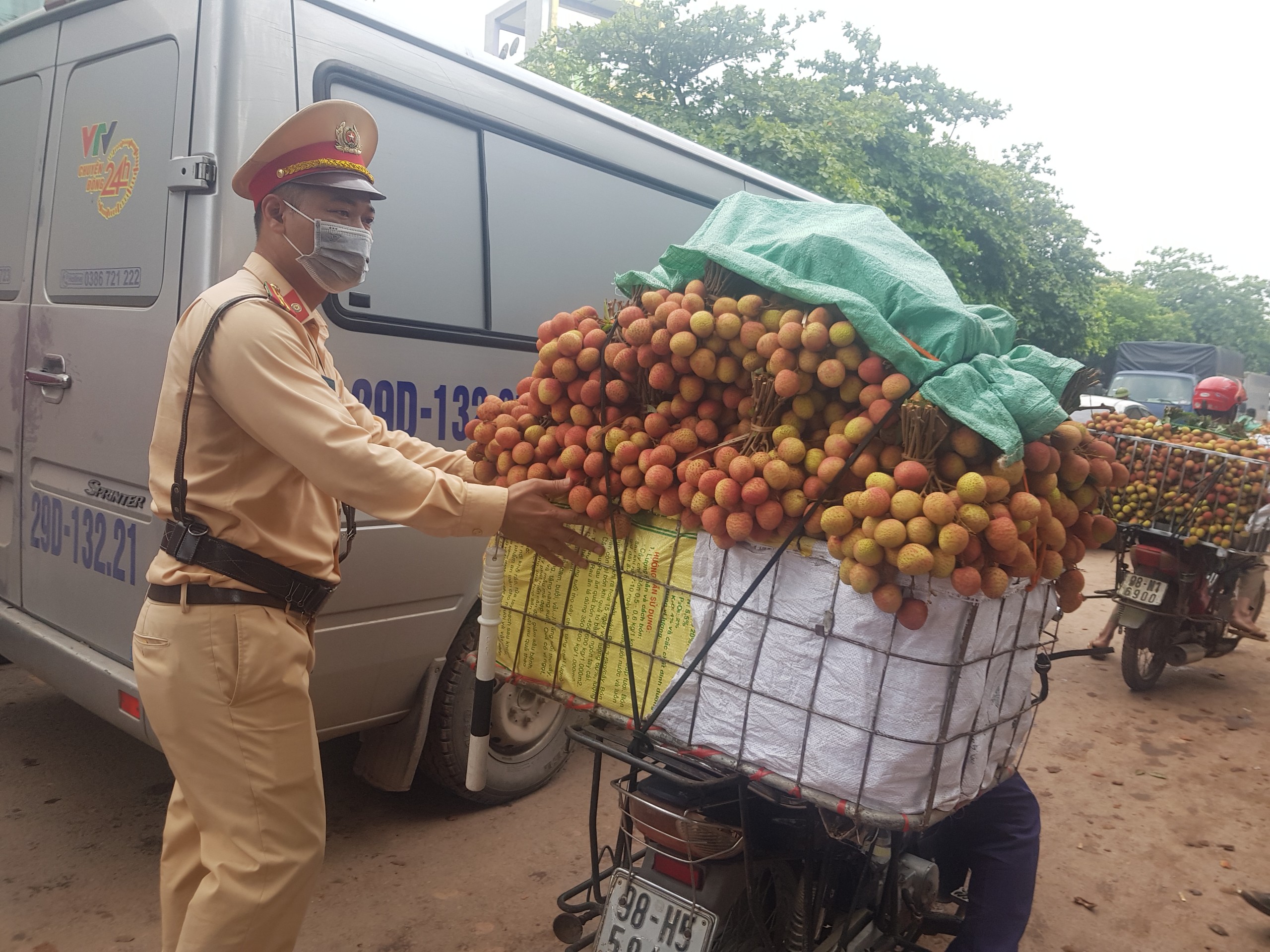 Cán bộ, chiến sĩ đội CSGT - TT Công an huyện Lục Ngạn (Bắc Giang) nhiều ngày dầm mưa dãi nắng đảm bảo an toàn giao thông cho việc vận chuyển, tiêu thụ vải thiều của người dân.