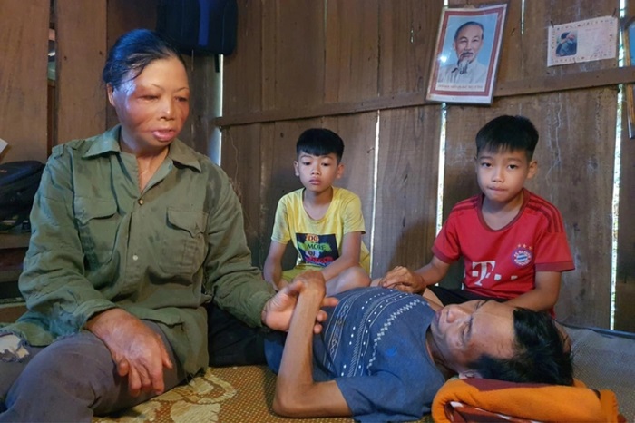 Chồng bị chất độc màu da cam khiến đôi chân bị liệt, vợ mắc bệnh thần kinh, hàng ngày vợ chồng anh chị phải chật vật nuôi hai con nhỏ mắc bệnh bại não.