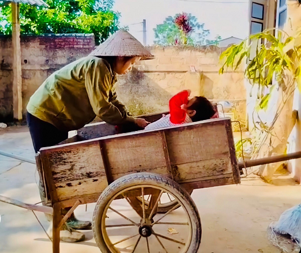 Hàng ngày, người dân trong tổ dân phố Làng Cả (Tuyên Quang) đều quen thuộc với hình ảnh mẹ bồng bế đứa con bại não đi làm ngoài đồng, ngoài mương bất kể nắng to hay mưa phùn. Cậu bé nằm trên chiếc ghế rung chờ mẹ làm việc khiến ai nấy đều xót xa.