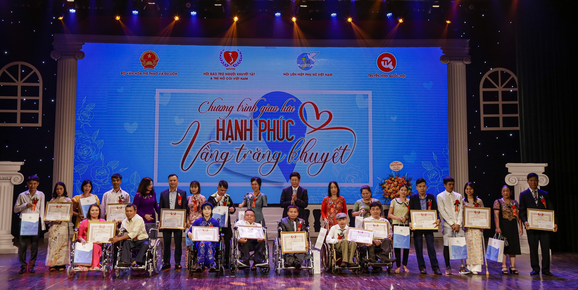 Tối 11/10, Chương trình giao lưu “Hạnh phúc vầng trăng khuyết” đã diễn ra tại Hà Nội với sự tham gia của 18 cặp vợ chồng đều khuyết tật, 14 cặp chồng khuyết tật - vợ lành lặn và 3 cặp chồng lành lặn - vợ khuyết tật. Tuy hoàn cảnh khác nhau nhưng họ đều có chung nghị lực phi thường.