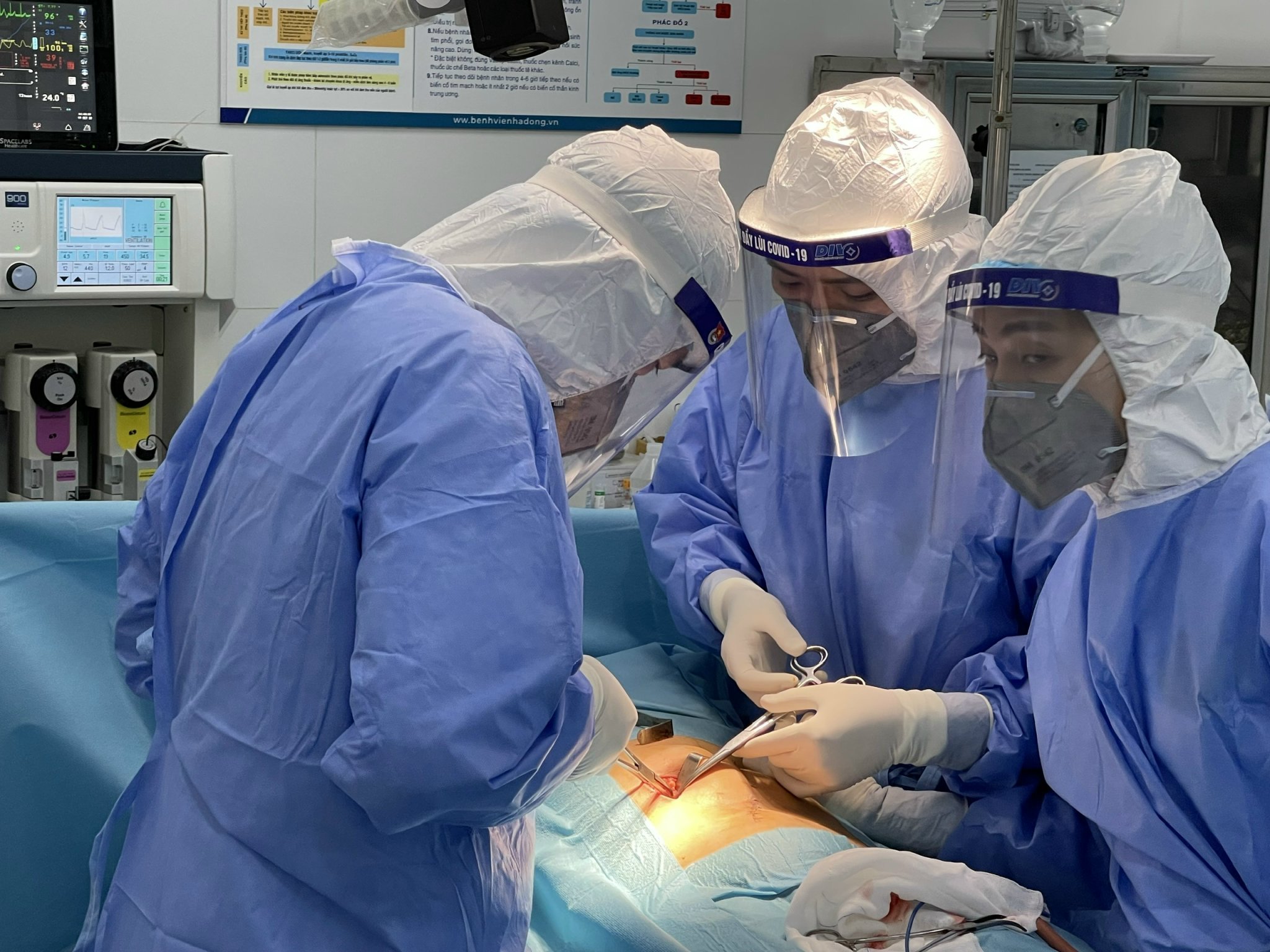 Từ khi có dịch Covid-19, Bệnh viện đa khoa Hà Đông đã tiến hành bố trí phòng phẫu thuật dành riêng cho bệnh nhân có yếu tố liên quan đến dịch tế Covid-19, khi có các tình huống cấp cứu xảy ra nhằm thể hiện sự chuyên nghiệp, cẩn trọng, tính toán chi tiết đến tất cả các phương án có thể xảy ra trong quá trình phẫu thuật nhằm đảm bảo an toàn tốt nhất cho nhân viên y tế và người bệnh.