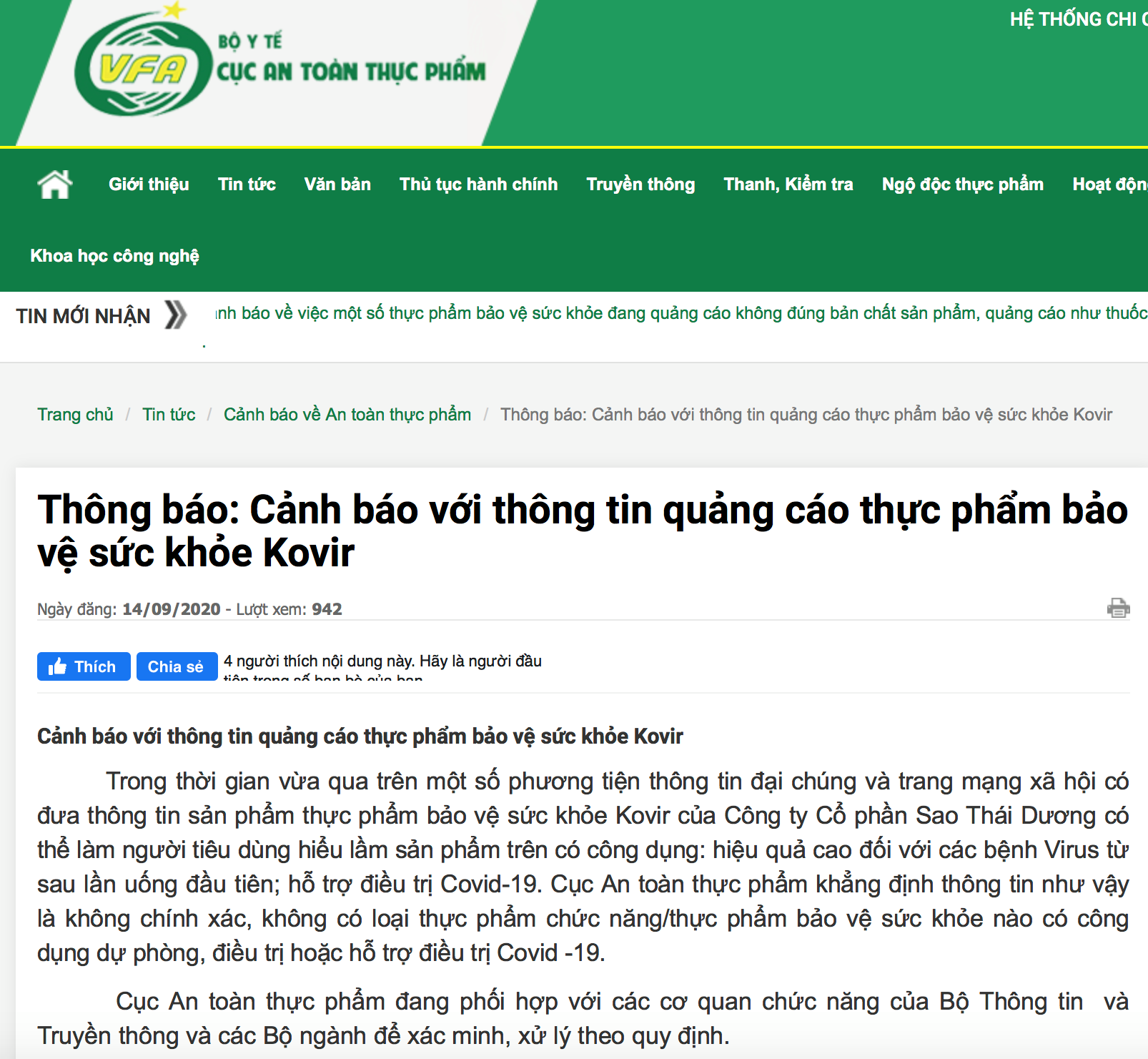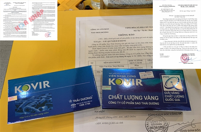 Những ngày qua, sau khi Bộ Y tế ban hành công văn số 5944/BYT-YDCT, trong đó công bố danh mục 12 thuốc cổ truyền và sản phẩm từ dược liệu được sử dụng để phòng và hỗ trợ điều trị COVID-19; đã xuất hiện hiện tượng một trong số các sản phẩm nằm trong danh mục này được “thổi phồng” công dụng và tăng giá một cách chóng mặt. Điển hình trong số đó là sản phẩm Viên nang Kovir của Công ty CP Sao Thái Dương.