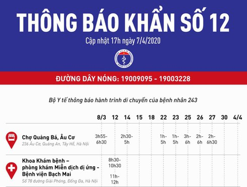 Bộ Y tế đề nghị tất cả những ai đến những địa điểm trong lịch trình di chuyển của BN243 dưới đây cần liên hệ ngay với Trung tâm Kiểm soát Bệnh tật các tỉnh, thành phố để được hướng dẫn theo dõi sức khỏe.