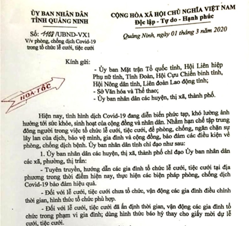 Trước diễn biến phức tạp, khó lường của dịch bệnh Covid-19, ảnh hưởng nghiêm trọng tới sức khỏe, sinh hoạt của cộng đồng và nhân dân, ngày 1/3/2020, UBND tỉnh Quảng Ninh đã ban hành văn bản số 1168/UBND-VX1 về việc phòng chống dịch Covid-19 trong tổ chức lễ cưới, tiệc cưới.