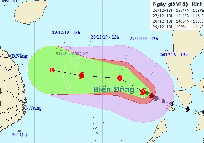 Theo Trung tâm dự báo khí tượng thủy văn quốc gia, hồi 16 giờ ngày 27/12, vị trí tâm bão ở khoảng 15,0 độ Vĩ Bắc; 116,2 độ Kinh Đông, cách quần đảo Hoàng Sa khoảng 480km về phía Đông Đông Nam. Sức gió mạnh nhất vùng gần tâm bão mạnh cấp 10-11 (90-115km/giờ), giật cấp 13.