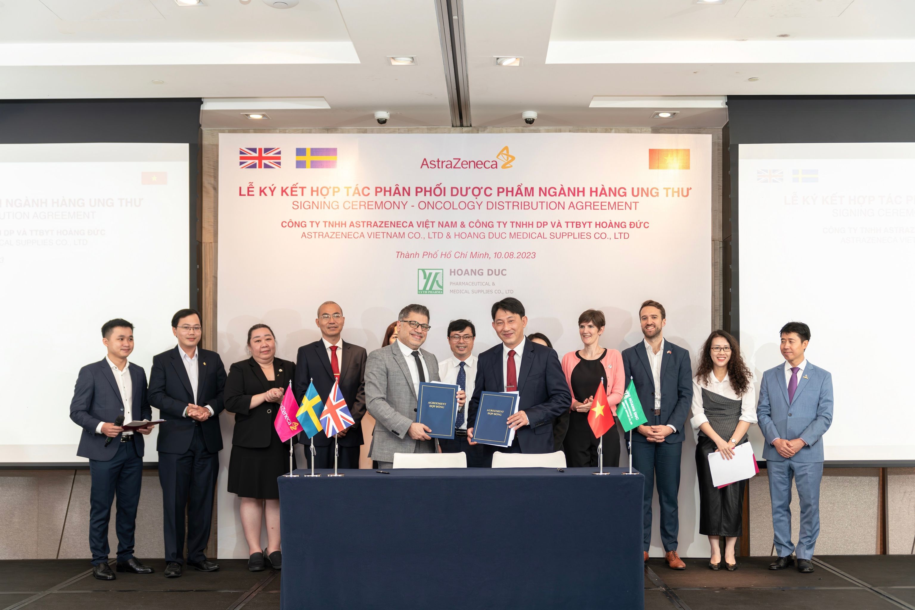 Công ty TNHH AstraZeneca Việt Nam và Công ty TNHH Dược phẩm và Trang thiết bị y tế Hoàng Đức đã ký kết hợp tác phân phối dược phẩm ngành hàng ung thư dưới sự chứng kiến của đại diện Sở Y tế TPHCM, Tổng lãnh sự quán Anh, các bệnh viện, cơ quan y tế tại TPHCM.