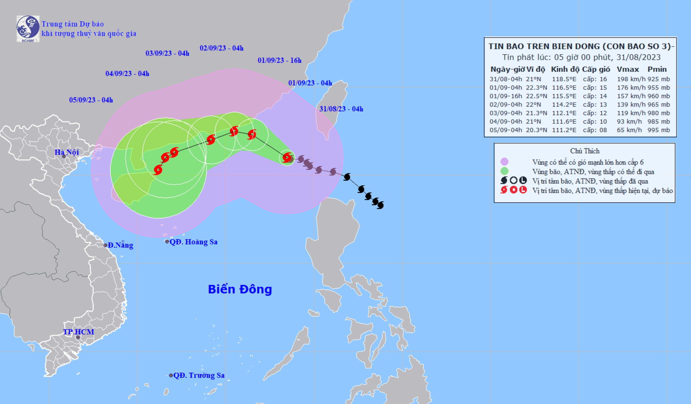 Theo Trung tâm Dự báo Khí tượng Thủy văn Quốc gia, hồi 4 giờ ngày 31/8, vị trí tâm bão số 3 ở vào khoảng 21 độ Vĩ Bắc; 118,5 độ Kinh Đông, trên vùng biển phía Đông Bắc của khu vực Bắc Biển Đông, cách Hong Kong (Trung Quốc) khoảng 510km về phía Đông Nam.