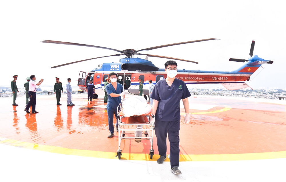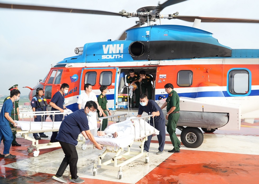 Khoảng 7h ngày 6/9, trực thăng Super Puma L2, số hiệu VN-8614 đã hạ cánh xuống sân đỗ Viện chấn thương chỉnh hình, Bệnh viện Quân y 175, đưa 3 người dân gặp nạn khi lặn tại vùng biển Trường Sa về đất liền điều trị.