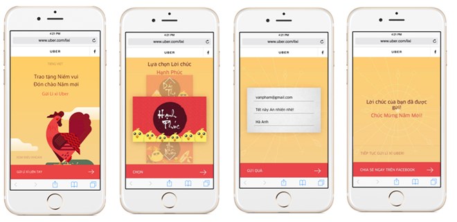 Từ 25/1 tới 25/2, thông qua ứng dụng Uber, người dùng tại Việt Nam có cơ hội gửi những bao lì xì chứa lời chúc và mã khuyến mại của hãng tới người thân.