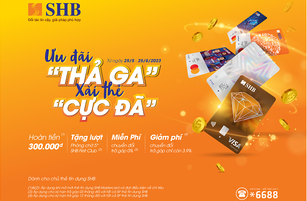 Nhân dịp hè 2023, Ngân hàng Sài Gòn – Hà Nội (SHB) triển khai chương trình khuyến mại “Ưu đãi thả ga – Xài thẻ cực đã” với nhiều ưu đãi hấp dẫn dành cho khách hàng mở mới thẻ và đăng ký trả góp bằng thẻ tín dụng quốc tế SHB.