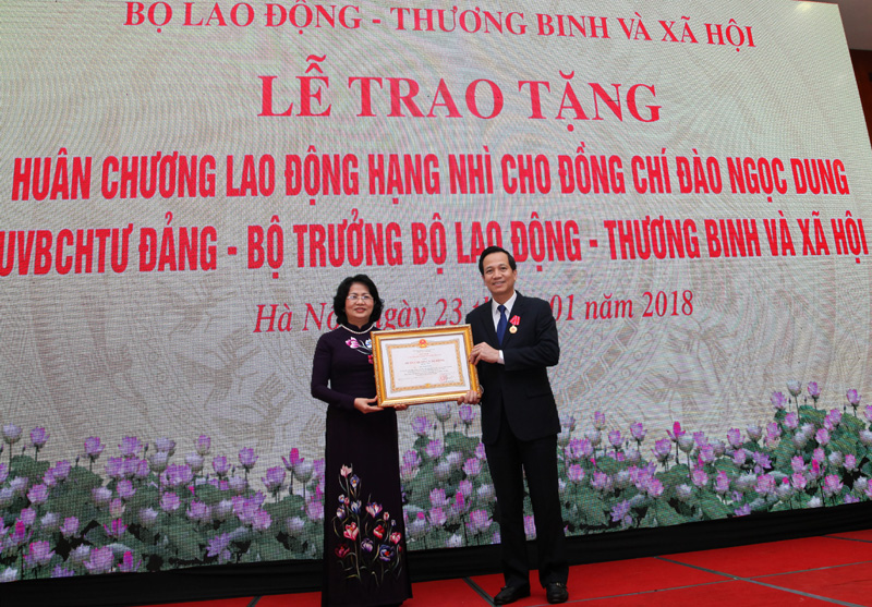 Chiều ngày 23/1, tại Hà Nội, Bộ LĐ-TB&XH tổ chức Hội nghị đại biểu cán bộ, công chức, viên chức năm 2017. Tại Hội nghị, Phó chủ tịch nước Đặng Thị Ngọc Thịnh trao tặng Huân chương Lao động hạng Nhì cho Bộ trưởng Bộ LĐ-TB&XH Đào Ngọc Dung. Tham dự Hội nghị có các Thứ trưởng: Đào Hồng Lan, Lê Tấn Dũng, Lê Quân.