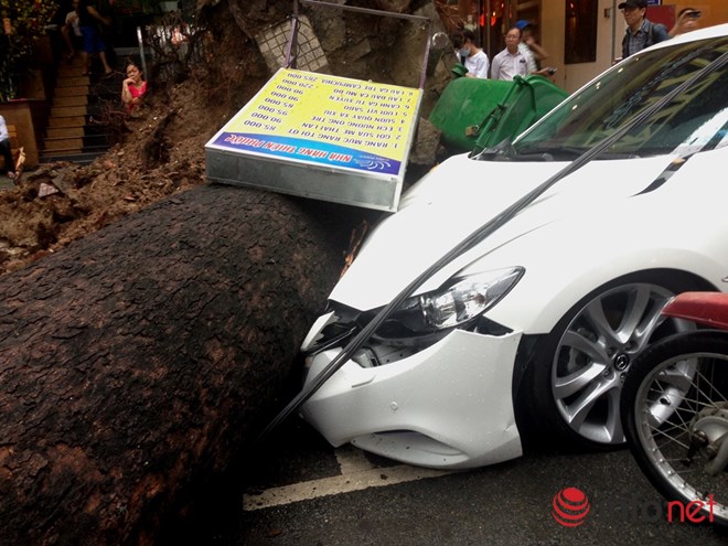 Cơn mưa lớn kéo theo gió đã làm bật gốc cây cổ thụ trên đường An Dương Vương đè trúng 1 người, 1 ô tô, ít nhất 5 xe máy vào chiều nay 28/8.