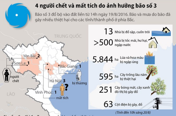 Bão số 3 đổ bộ vào đất liền từ 14 giờ ngày 19/8. Bão và mưa do bão đã gây nhiều thiệt hại cho các tỉnh/thành phố ở phía Bắc. Tính đến tối ngày 20/8, bão đã làm chết 3 người, 1 người bị mất tích, gây nhiều thiệt hại về người và của.