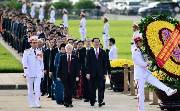 7h sáng 20/7, Tổng bí thư Nguyễn Phú Trọng, Chủ tịch nước Trần Đại Quang dẫn đầu đoàn đại biểu Quốc hội khóa XIV vào lăng viếng Chủ tịch Hồ Chí Minh trước kỳ họp đầu tiên.