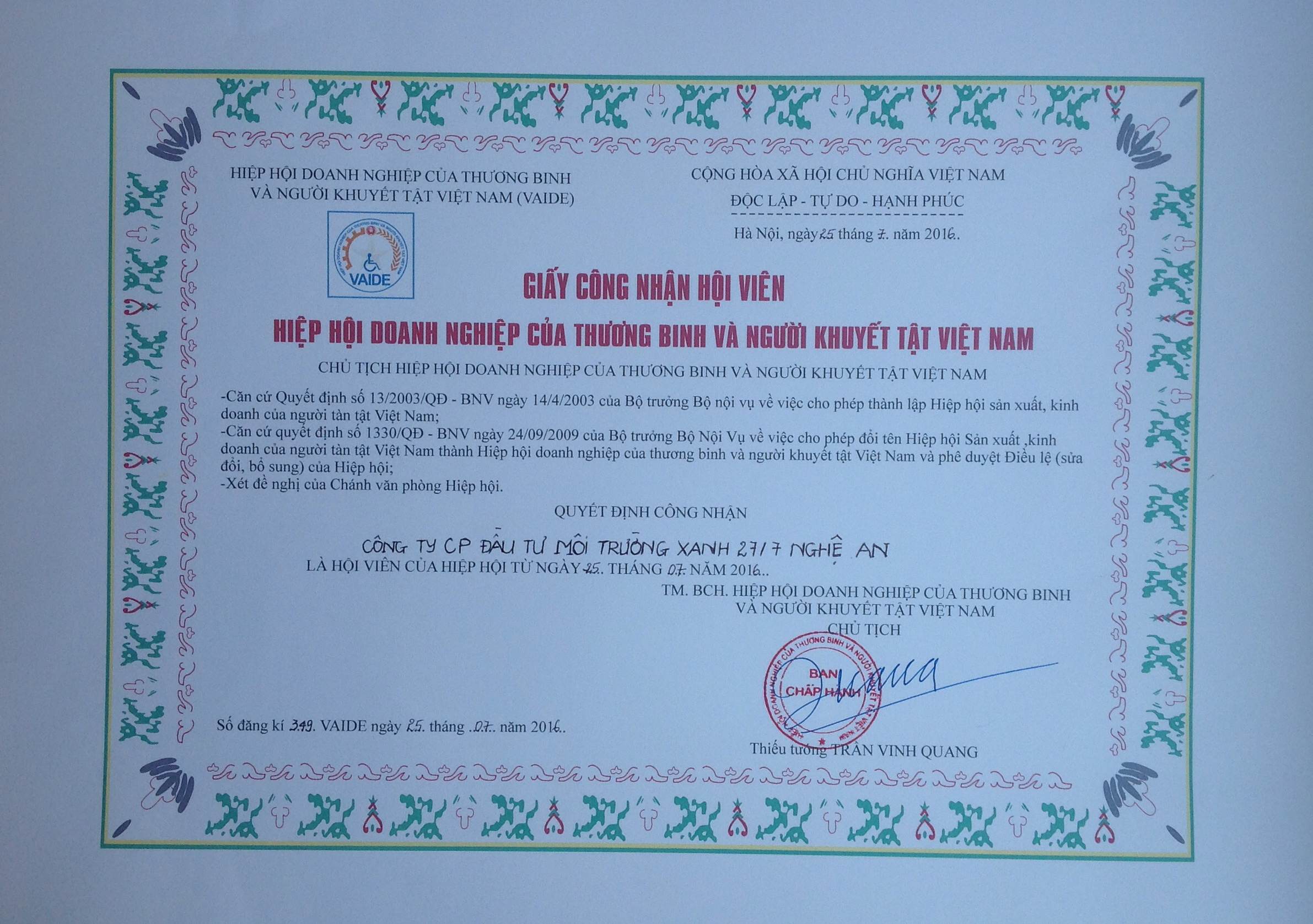 HOANHAP.VN - Trong không khí cả nước hướng về kỷ niệm 69 năm Ngày Thương binh, liệt sỹ, ngày 25/7/2016, Chủ tịch Hiệp hội Doanh nghiệp của Thương binh và Người khuyết tật Việt Nam (VAIDE)- Thiếu tướng Trần Quang Vinh đã ký quyết định (số 39/QĐ-VIDE) công nhận Công ty CP Đầu tư Môi trường Xanh 27/7 Nghệ An là thành viên chính thức của Hiệp hội.