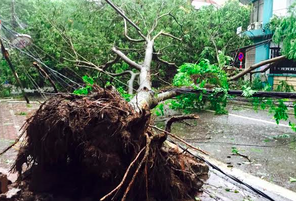 Gió đang giật rất mạnh, xe máy đổ, cây bật gốc cả loạt trên đường Hà Nội. Không nên đi xe máy, xe đạp.