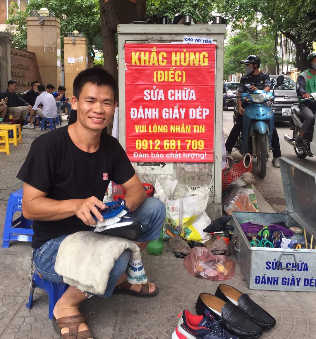 Anh Khắc Hùng bị câm điếc bẩm sinh, công việc hàng ngày của anh là đánh giầy, sửa giầy tại số 03 Chùa Láng