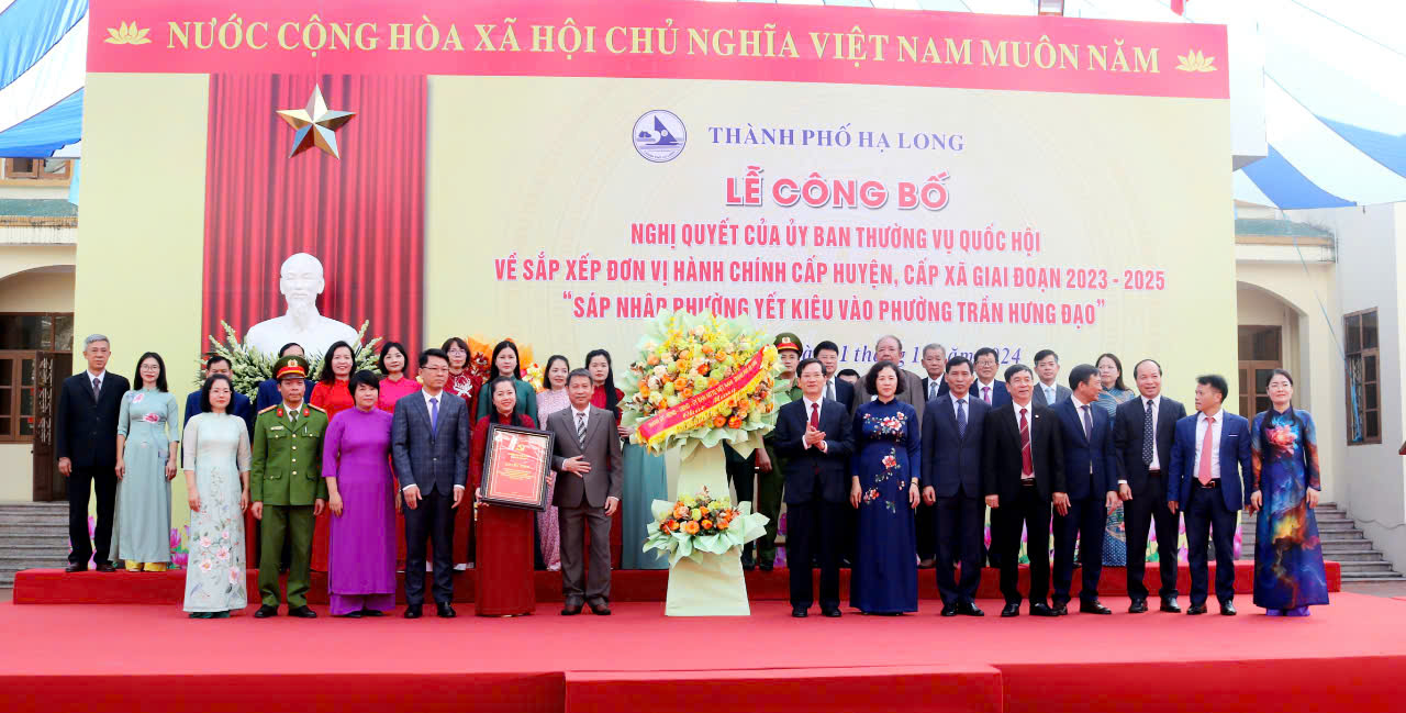 Sáng ngày 1/11, thành phố Hạ Long (Quảng Ninh) đã long trọng tổ chức Lễ công bố Nghị quyết số 1199/NQ-UBTVQH15 ngày 28/9/2024 của Ủy ban Thường vụ Quốc hội về việc sắp xếp đơn vị hành chính cấp huyện, cấp xã của tỉnh giai đoạn 2023-2025 - sáp nhập phường Yết Kiêu vào phường Trần Hưng Đạo.