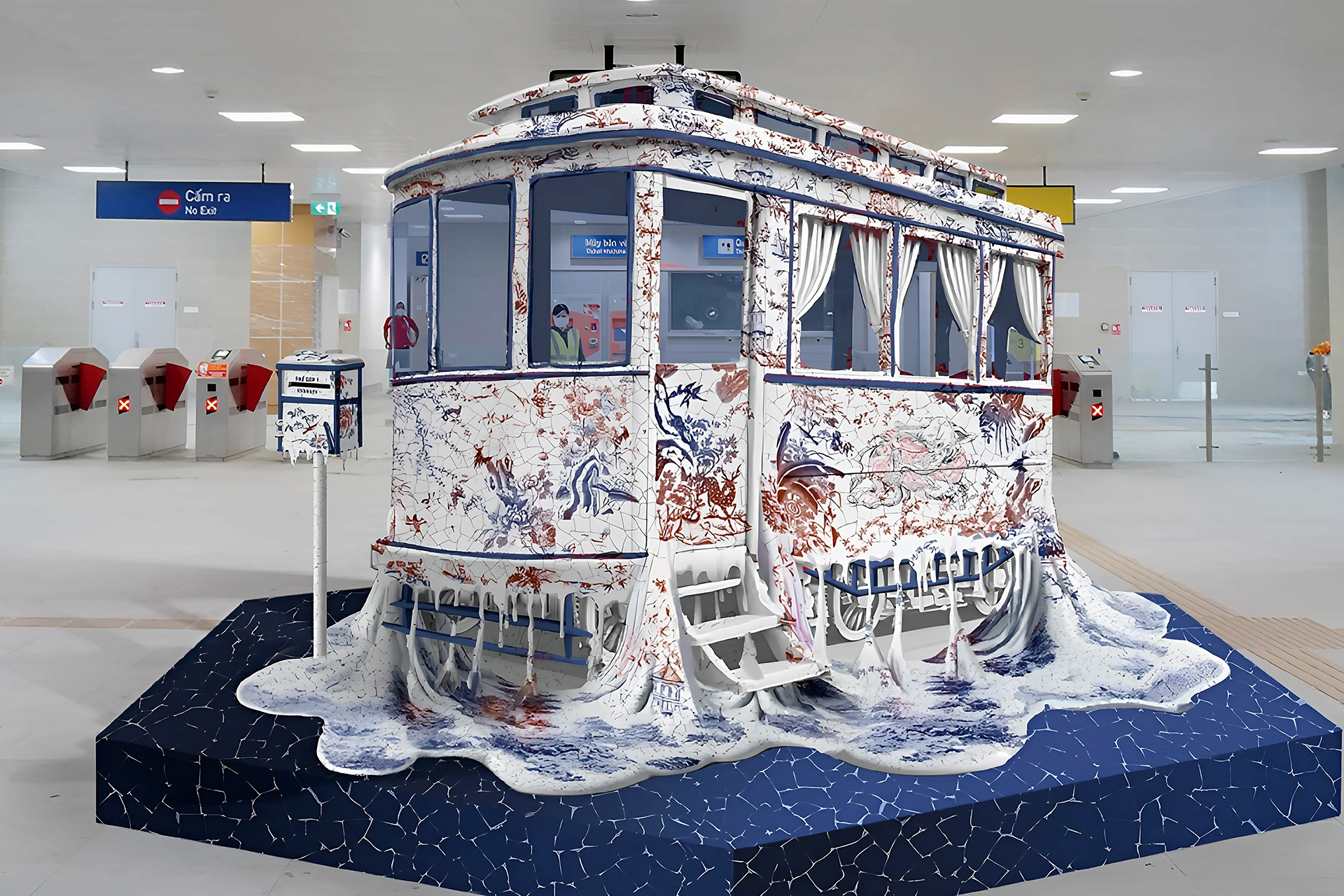 Tác phẩm công cộng 'Năm giờ sáng, Hà Nội thức giấc - Il est cinq heures, Hanoï s'éveille' khắc họa tàu điện khi xưa, được làm từ 15.000 mảnh gốm.