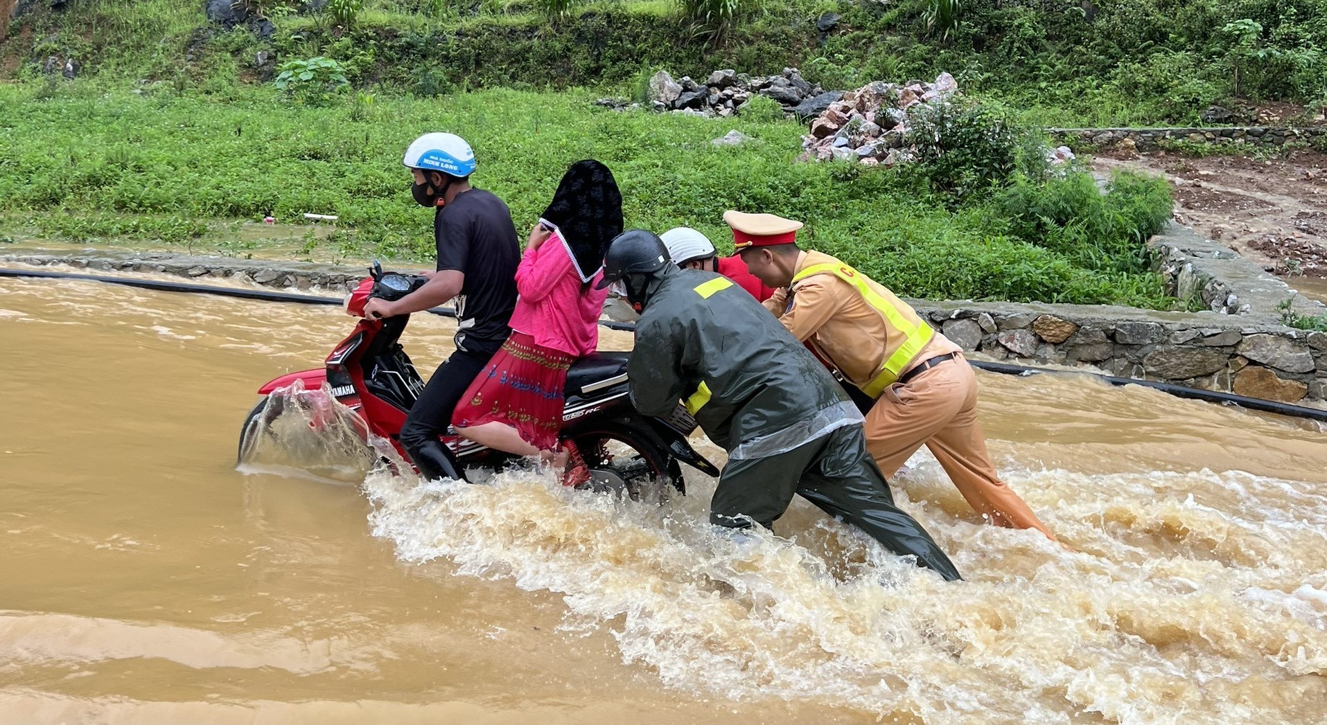 Những chiến sĩ cảnh sát giao thông huyện Mèo Vạc dầm mưa, lội nước lụt giúp dân đẩy xe chết máy, dùng ôtô chuyên dụng hỗ trợ du khách và người dân qua điểm ngập lụt.