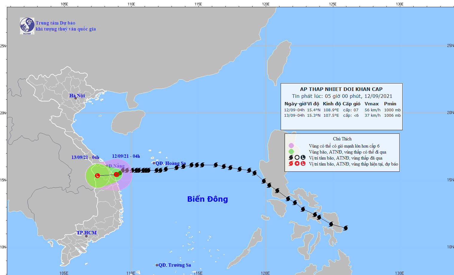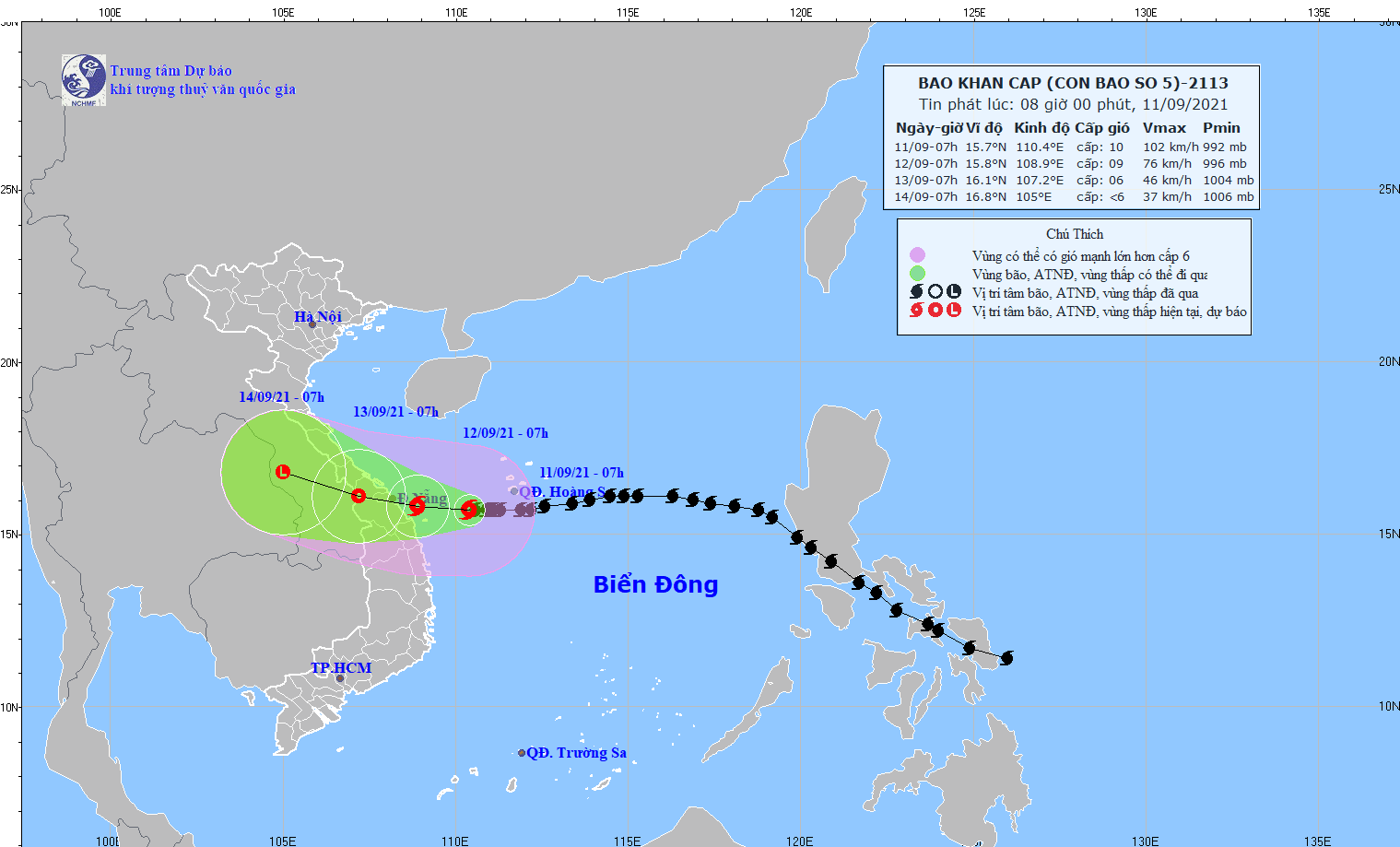 Ngày 11/9, vị trí tâm bão ở khoảng 15,7 độ Vĩ Bắc; 110,4 độ Kinh Đông, cách bờ biển Quảng Trị-Quảng Ngãi khoảng 210km về phía Đông. Sức gió mạnh nhất vùng gần tâm bão mạnh cấp 9-10 (75-100km/giờ), giật cấp 12.