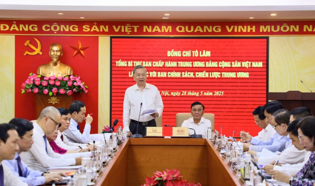 Chiều 28/5, đồng chí Tô Lâm, Tổng Bí thư Ban Chấp hành Trung ương Đảng Cộng sản Việt Nam đã có buổi làm việc với Ban Chính sách, chiến lược Trung ương về cơ chế, chính sách quản lý hiệu quả thị trường vàng trong thời gian tới.