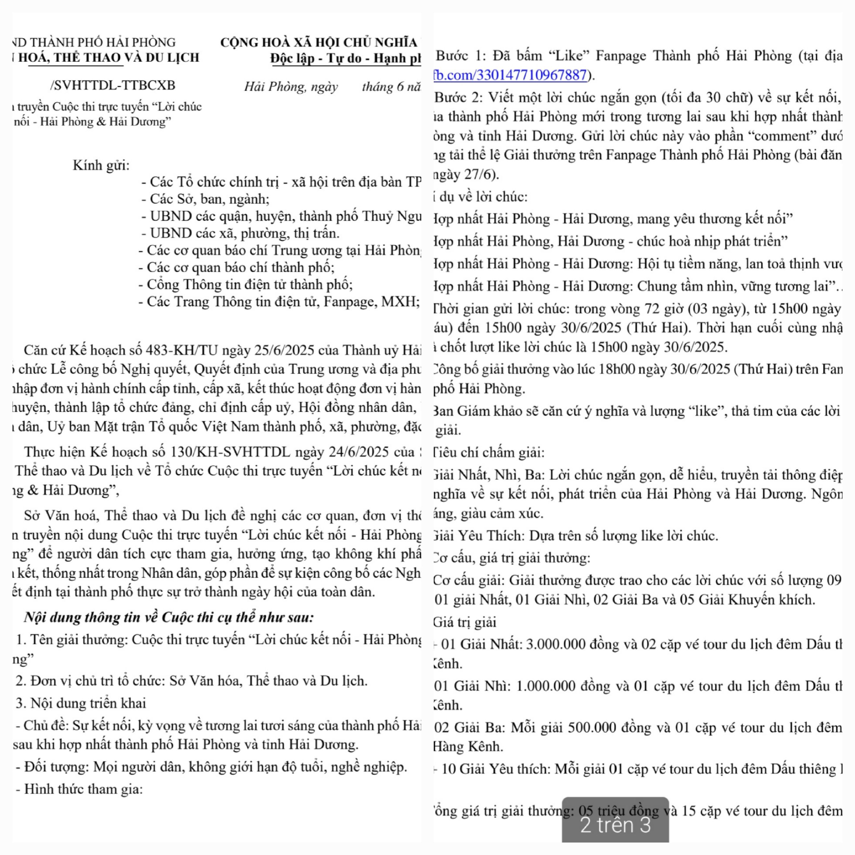 Căn cứ Kế hoạch số 483-KH/TU ngày 25/6/2025 của Thành uỷ Hải Phòng về tổ chức sáp nhập đơn vị hành chính cấp tỉnh, sở Văn hoá, Thể thao và Du lịch tổ chức cuộc thi trực tuyến “lời chúc kết nối - Hải Phòng & Hải Dương” tạo không khí phấn khởi, đoàn kết, thống nhất trong nhân dân.