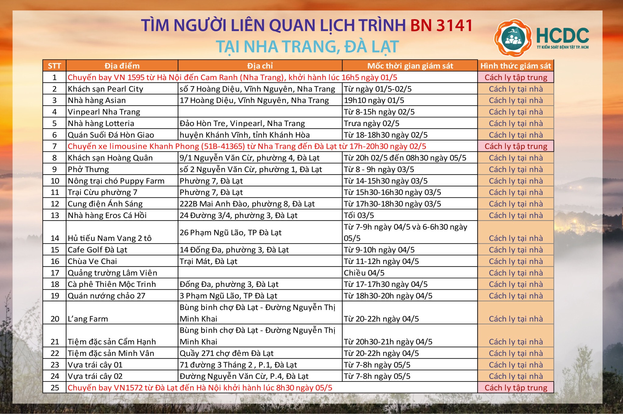 Chiều 9/5, Trung tâm Kiểm soát bệnh tật TP.HCM (HCDC) có thông báo tìm người liên quan lịch trình di chuyển của bệnh nhân 3141 (27 tuổi, con trai bệnh nhân 3140, quê Bắc Ninh) tại Nha Trang và Đà Lạt.