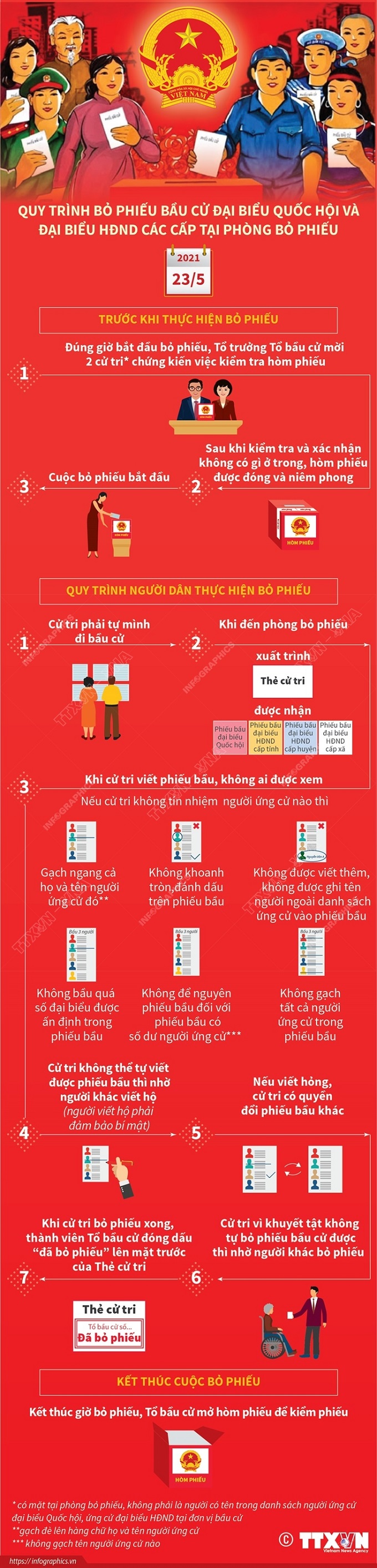 Dưới đây là quy trình bỏ phiếu bầu cử đại biểu Quốc hội khóa XV và đại biểu Hội đồng nhân dân (HĐND) các cấp nhiệm kỳ 2021 - 2016 tại phòng bỏ phiếu.