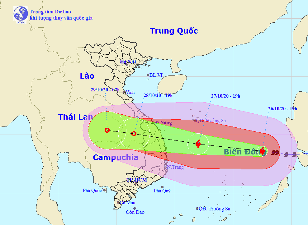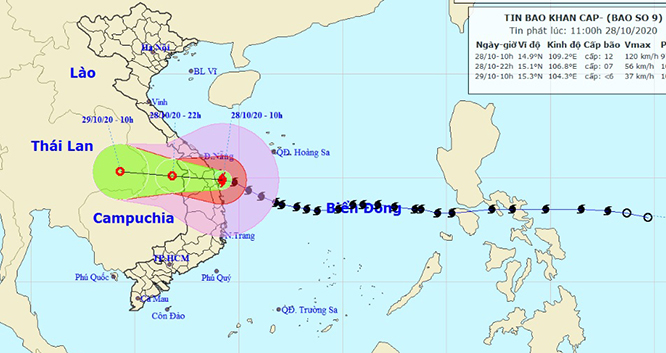 Bão số 9 vẫn đang có khả năng mạnh thêm và từ tối 27 đến 28-10 sẽ đổ bộ vào đất liền từ Đà Nẵng đến Phú Yên.