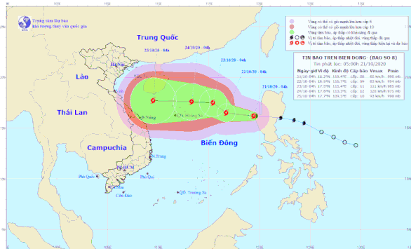 Bão số 8 mạnh cấp 8 đang di chuyển theo hướng Tây và liên tục mạnh thêm. Dự báo ngày 24-10, sức gió mạnh nhất vùng gần tâm bão lên cấp 11-12 (100-135km/giờ), giật cấp 14.
