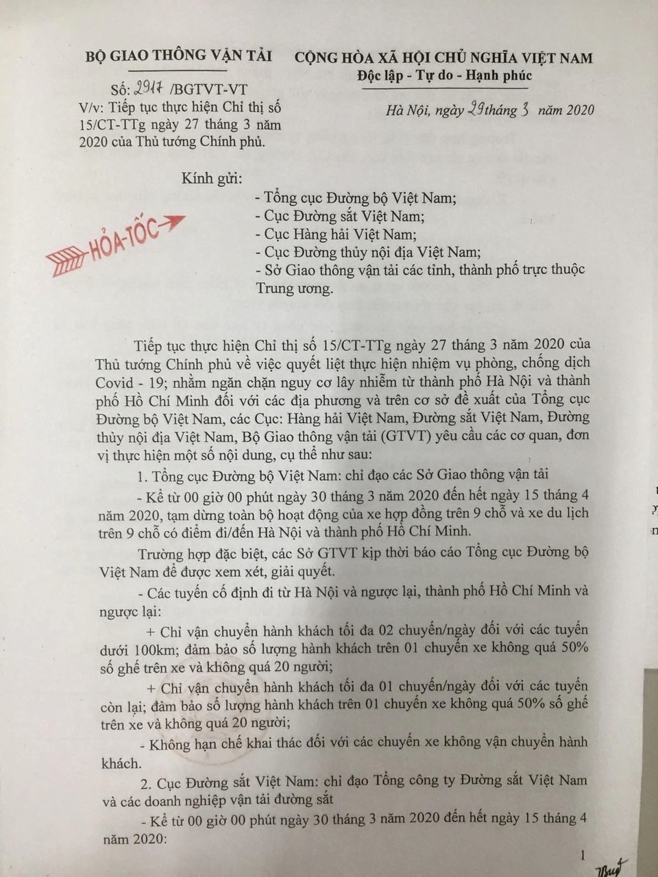 Bộ Giao thông vận tải (GTVT) vừa có văn bản hỏa tốc số 2917/BGTVT-VT gửi đến Tổng cục Đường bộ Việt Nam, Cục Đường sắt Việt Nam, Cục Hàng hải Việt nam, Cục Đường thủy nội địa Việt Nam cùng Sở GTVT các tỉnh, thành phố trực thuộc Trung ương về việc quyết liệt thực hiện nhiệm vụ phòng, chống dịch Covid-19.