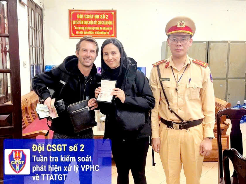 Phòng Cảnh sát giao thông Công an tỉnh Quảng Ninh vừa trao trả tài sản để quên trên xe khách cho 2 du khách người Pháp là Khadija Baga và Ledric Prescelti.