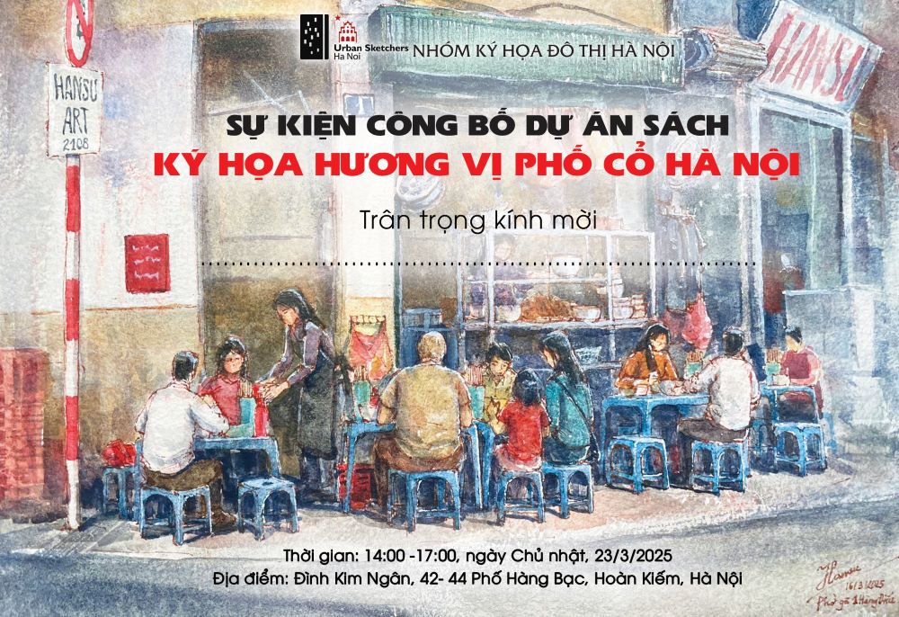 Hà Nội, ngày 23 tháng 3 năm 2025, tại Đình Kim Ngân, số 42 Hàng Bạc, Hoàn Kiếm, Urban Sketchers Hà Nội sẽ tổ chức sự kiện ra mắt dự án sách "Ký Họa Hương Vị Phố Cổ Hà Nội". Đây là một tác phẩm đặc biệt, ghi lại vẻ đẹp của ẩm thực phố cổ Hà Nội qua ký họa nghệ thuật và những câu chuyện đầy cảm xúc. Sự kiện diễn ra từ 14h đến 17h và hứa hẹn sẽ mang đến một trải nghiệm văn hóa đa chiều.