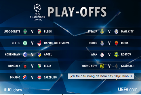 Lịch thi đấu bóng đá ngày 16/8 rạng sáng 17/8, diễn ra những trận đấu ở vòng loại Champions League 2016/17.