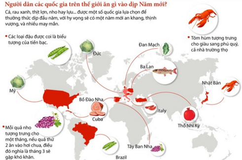 Cá, rau xanh, thịt lợn, nho hay lựu... được một số quốc gia lựa chọn để thưởng thức dịp đầu năm, với hy vọng sẽ có một năm mới an khang, thịnh vượng và nhiều may mắn.