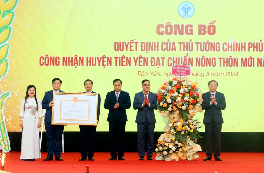 Ngày 15/3/2024, huyện Tiên Yên đã long trọng tổ chức Lễ đón nhận huyện đạt chuẩn nông thôn mới nâng cao. Tham dự buổi lễ có các đồng chí lãnh đạo tỉnh Quảng Ninh, các đại biểu của Văn phòng Điều phối nông thôn mới Trung ương; Văn phòng điều phối Chương trình MTTQ phát triển kinh tế - xã hội vùng đồng bào DTTS và miền núi; lãnh đạo Đoàn ĐBQH tỉnh, HĐND, UBND, Ủy ban MTTQ tỉnh, các sở, ngành, địa phương cùng đông đảo nhân dân các dân tộc trên địa bàn huyện.