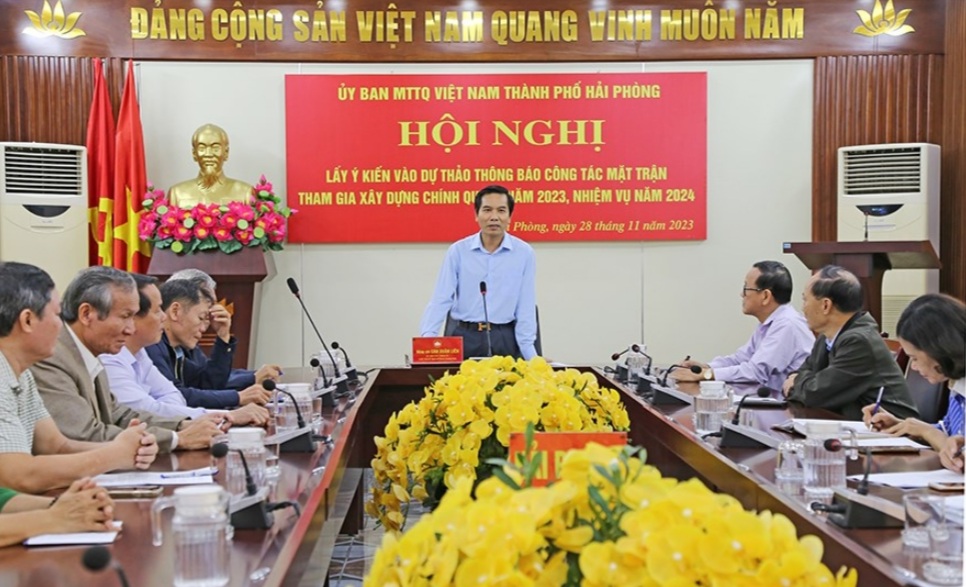 Sáng 28/11, UB MTTQ Việt Nam thành phố tổ chức Hội nghị lấy ý kiến tham gia vào dự thảo Thông báo công tác Mặt trận tham gia xây dựng chính quyền năm 2023, nhiệm vụ năm 2024, trình tại Kỳ họp thứ 13, HĐND thành phố khóa XVI (nhiệm kỳ 2021 - 2026).