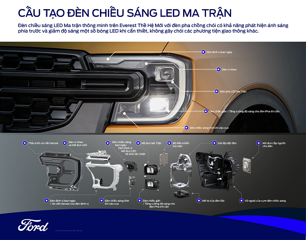 Nhờ công nghệ chiếu sáng tiên tiến trên chiếc Ford Everest Thế Hệ Mới, việc lái xe ban đêm đã trở nên thoải mái hơn. Tiêu biểu như người lái có thể sử dụng hệ thống đèn chiếu sáng LED Ma Trận với đèn pha chống chóiiii để tăng cường mức độ chiếu sáng mà không làm chói mắt những phương tiện tham gia giao thông khác.